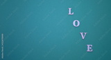 Word LOVE made of wooden letters close up isolated on aquamarine color background copy space