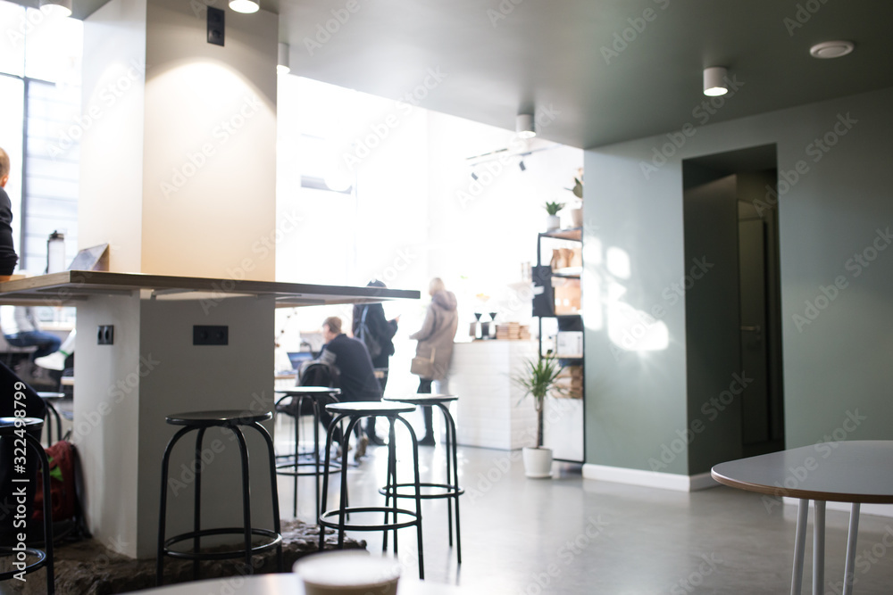 Blurred photo of a cafe with people. Coffee shop with a white interior.