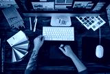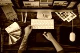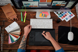 Professional web illustrator. Top view of a graphic designer using graphic tablet and computer in the office or studio. Workplace with graphic tablet, keyboard, computer and color swatches