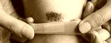 Abrasion on the woman's knee. Girl is applying antiseptic band-aid plaster on the injured leg with a red wound. Medical treatment.