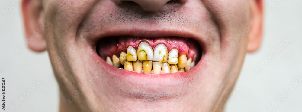 Plaque teeth cavities and paradontosis in the man's mouth. Dental decay problems and bad smile. Dentist treatment concept.