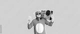 Man in cosplay costume of a cow with reel tape recorder isolated on yellow background. Guy in the animal pyjamas sleepwear. Funny photo with party ideas. Disco retro music.