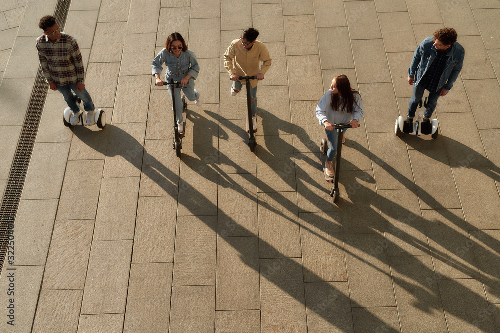 Real team. Joyful friends riding kick scooters and segways
