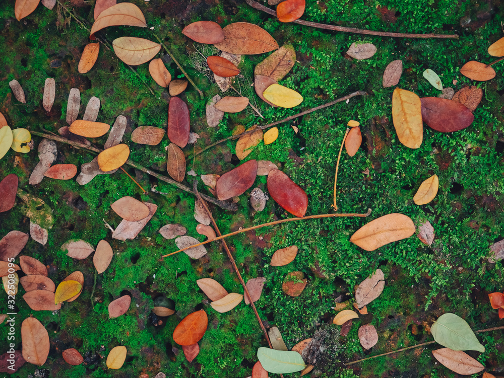 Green fern leaves with dried leaves Park outdoor texture Nature background