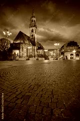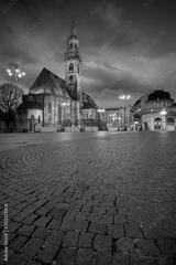Bolzano, Italy. Cityscape image of historical city of Bolzano, Trentino, Italy with Bolzano Cathedral and the Walther Square during twilight blue hour.