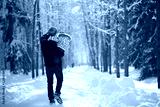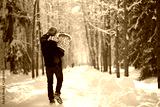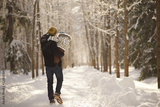 Young man with child on hands walking down the path in sunny winter park, snowy trees and snowbanks. View from behind