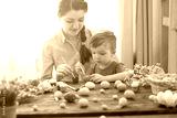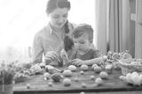 Charming mother and son celebrating Easter. Family celebrating Easter. Parent and kid play indoors. Decorated home and spring flowers