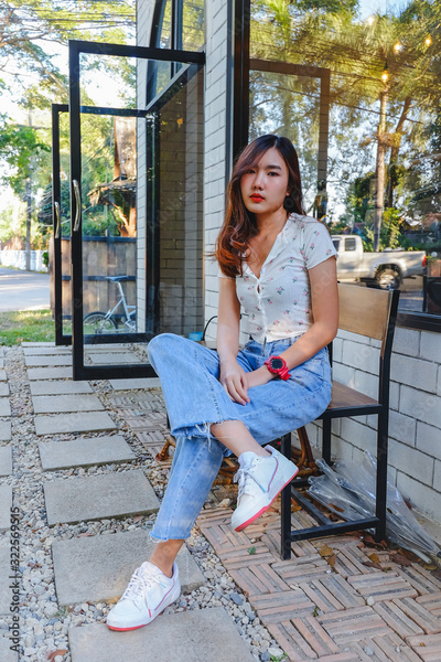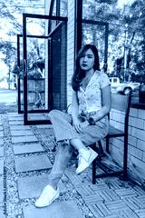Young woman sitting on bench at coffee shop.