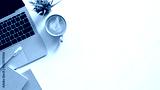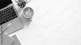 Top view of white working table with office equipment putting on it. Flat lay Computer laptop, Coffee cup, Potted plant, Notebook and pencil. Modern and comfortable working desk concept.