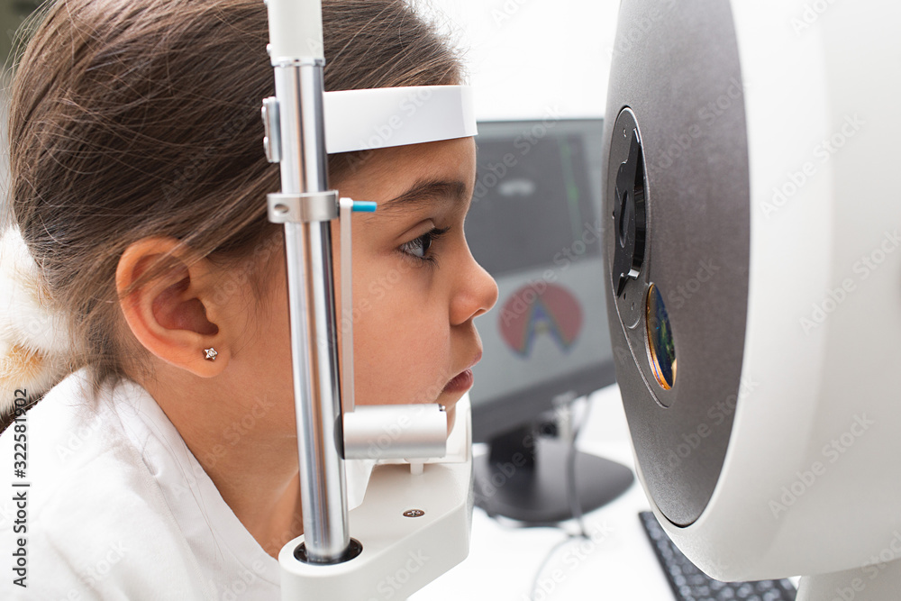 Tomography of eyes of a little girl patient. Advanced eye test equipment. Girl's face close up. Vision correction