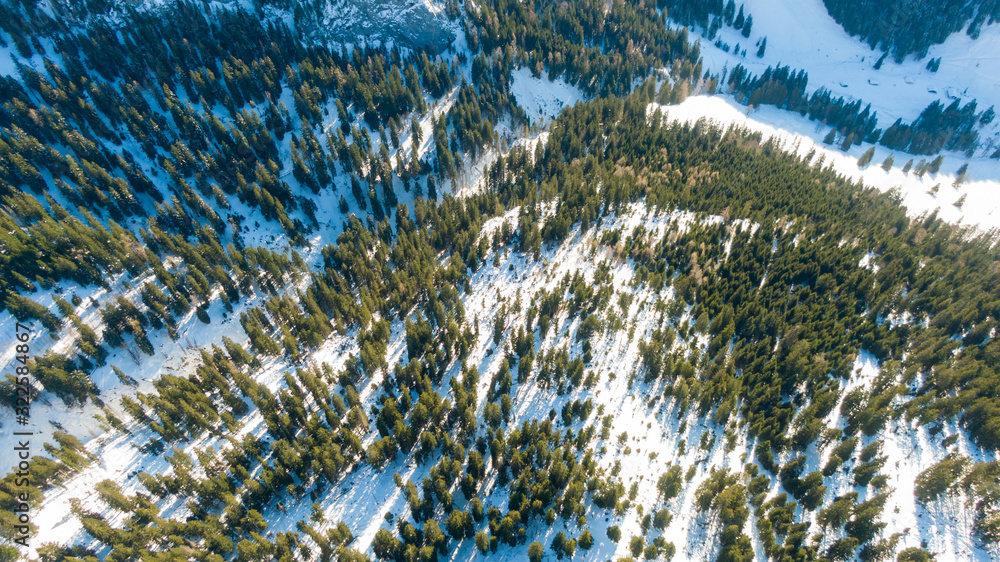 Aerial view on forest in winter, trees cover with snow, Hallstatt austria winter time