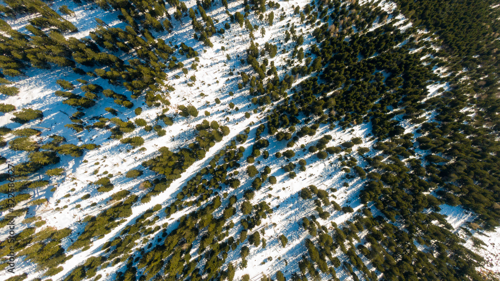 Aerial view on forest in winter, trees cover with snow, Hallstatt austria winter time