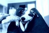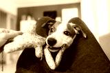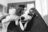 Small dog playing with colorful knitted toy in her home. Closeup view