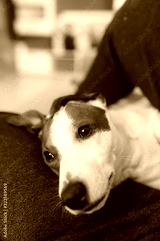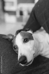 Dog jack russell terrier put his head woman on her knees. Vertical view