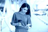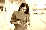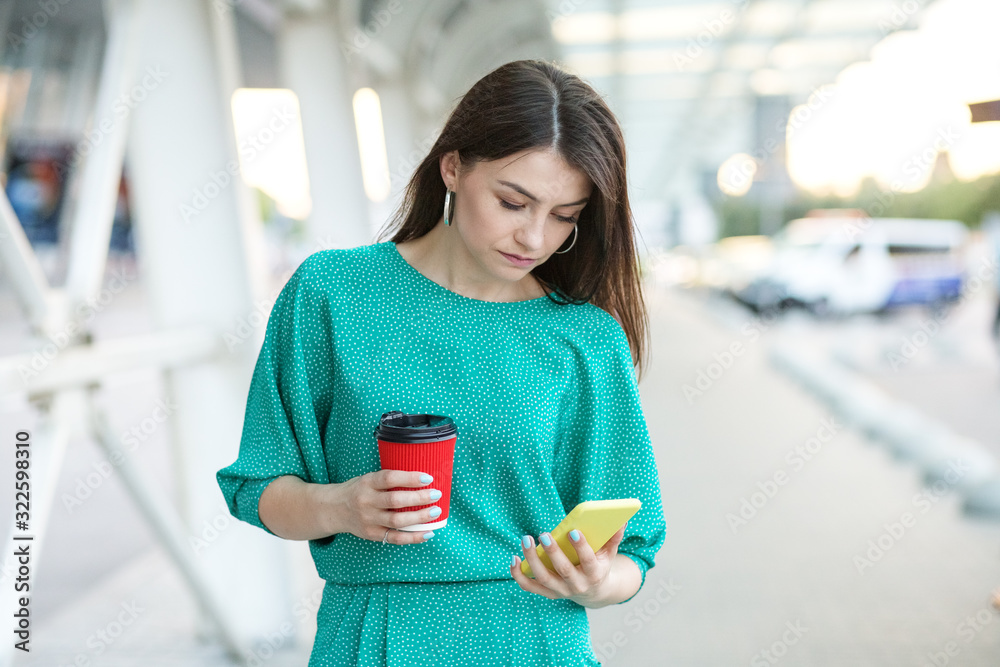 Young intelligent woman with a smartphone. Hot coffee in a plastic glass. Green dress. The concept of business, lifestyle and technology.