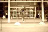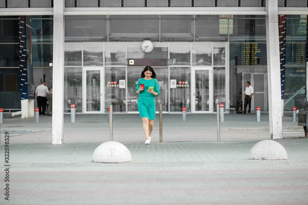 Young adult brunette looking in smatfon and cross the road. Hot coffee in a plastic glass. Green dress. The concept of business, work and technology.