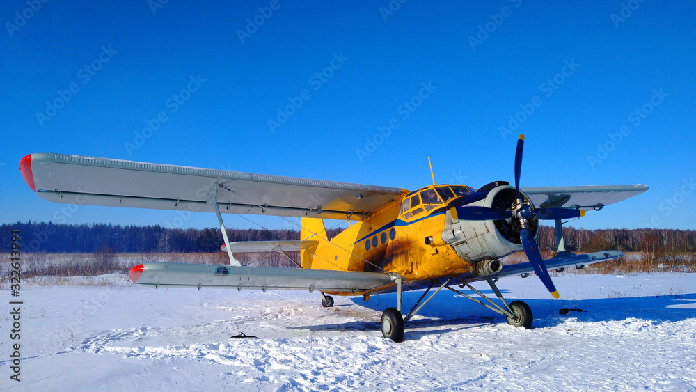A yellow old biplane plane is parked on a winter airfield against a background of bright blue sky and white snow with the engine running and smoke