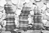 Wobbly towers made of diverse old coins, selective focus, color toning applied.