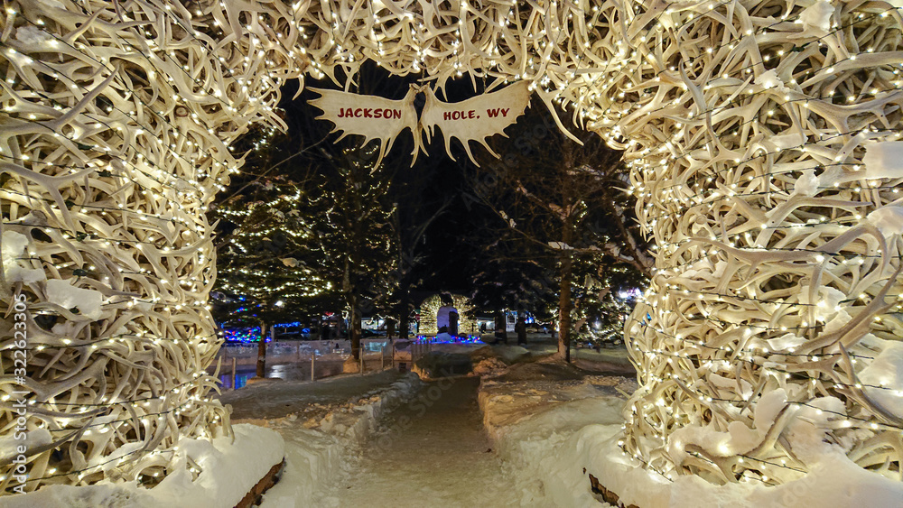 CLOSE UP: Christmas lights arc over a walkway in a snowy park in Jackson Hole.