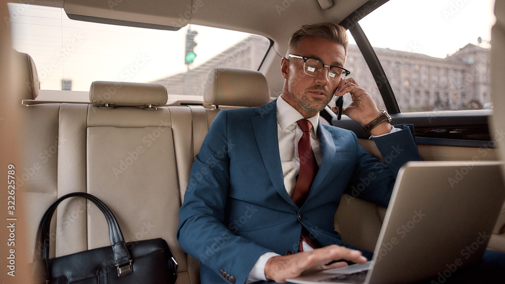 Working Anywhere. Confident and stylish mature businessman in full suit working on his laptop and talking on the phone with client while sitting in the car