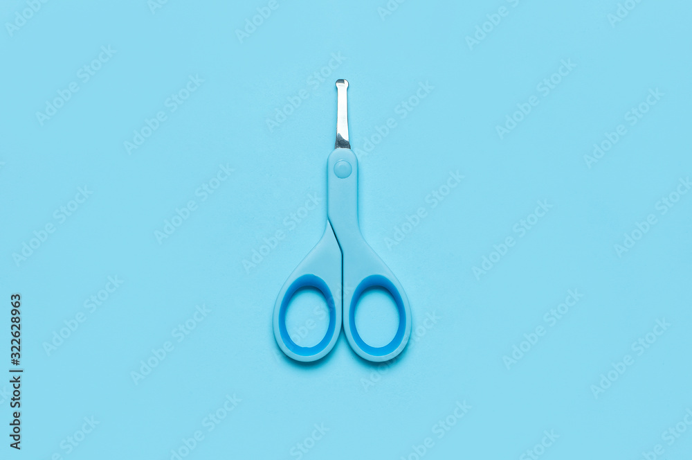 Baby blue scissors for hygiene on blue background top view flat lay copy space. Metal and plastic baby nail scissors. Manicure scissors. Baby care concept. Cosmetic accessory for boy