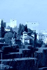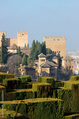 Landscape design of Generalife gardens with Alhambra citadel on the background