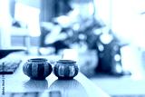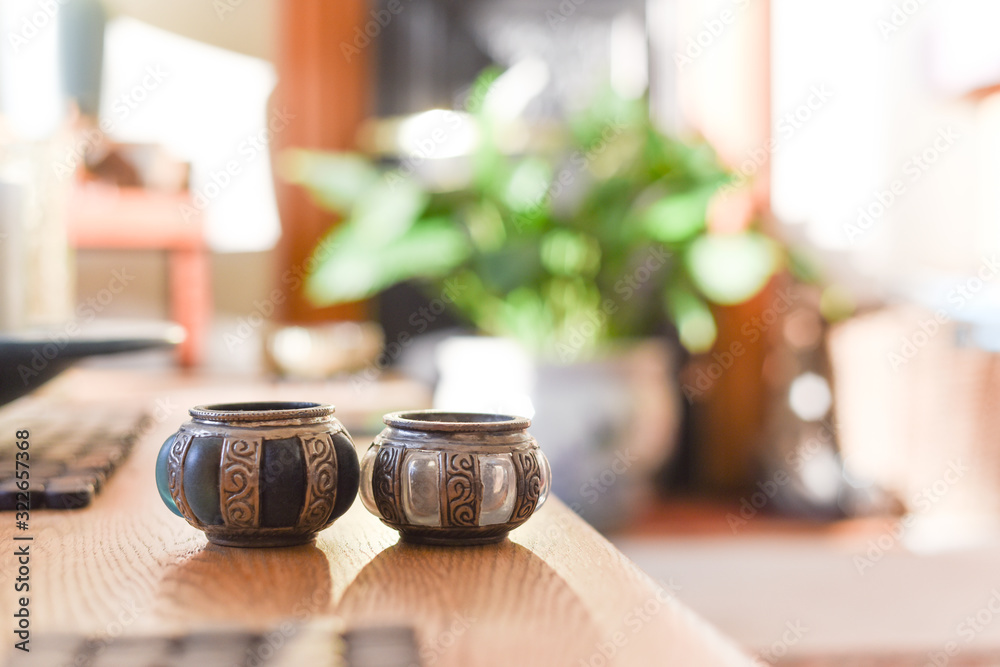 Stylish home interior in natural daylight from window with candle ornament on coffee table