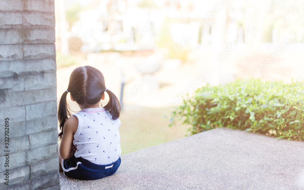 Back view of Little baby toddler girl sulk and sitting alone watching garden in school.Concept of bullied school girl.First day of school.Sad girl miss her mother in school.