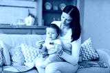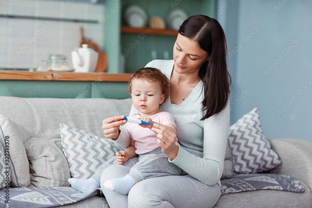 A mother with a sick child in her arms checks the temperature on a thermometer