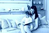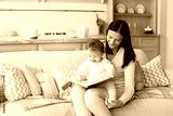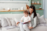 Mom sits on a sofa with a child, reads a book and looks at bright pictures