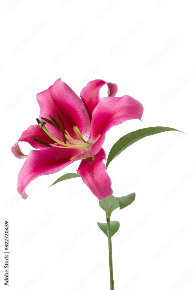 Single Lily pink flower isolated on white background with green leaves, beautiful seasonal flower head