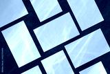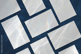 Closeup of empty white rectangle business card mockups with overlay of water shadow and light caustic effect lying diagonally on dark blue concrete background. Flat lay, top view. Open composition.