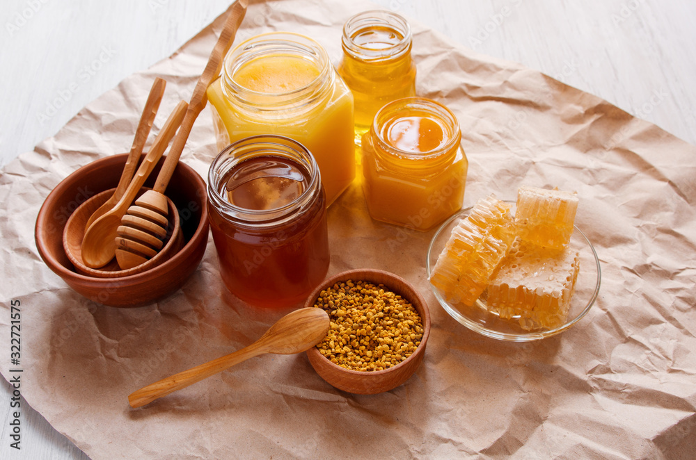 Bee liquid flower honey in glass jars, pollen and honeycomb on table