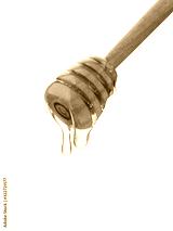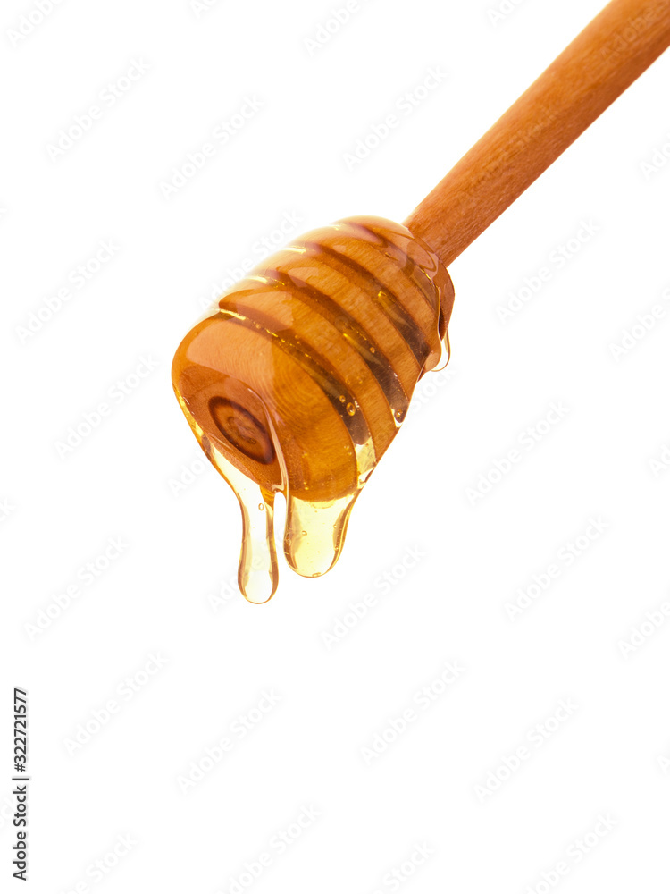Isolated bee honey drops on wooden stick, Apian honey spoon on white background
