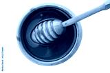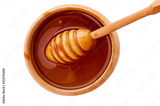 Honey pot and wooden dipper stick isolated on white background with clipping path, package design element, top view.