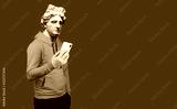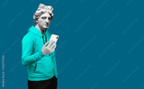 Modern art collage. Concept portrait of a man holding mobile smartphone using app texting sms message. Gypsum head of of Apollo. Man in suit. On a blue background.