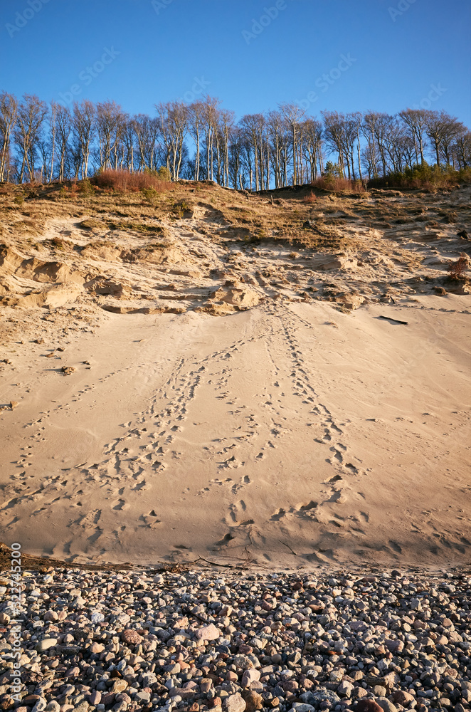 Footprints on a cliff by a Baltic Sea rocky beach at sunset.