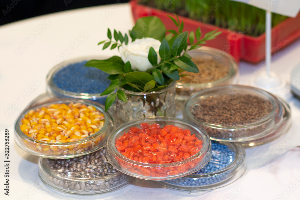 Multi-colored seeds with glass cups on a laboratory table. Agriculture