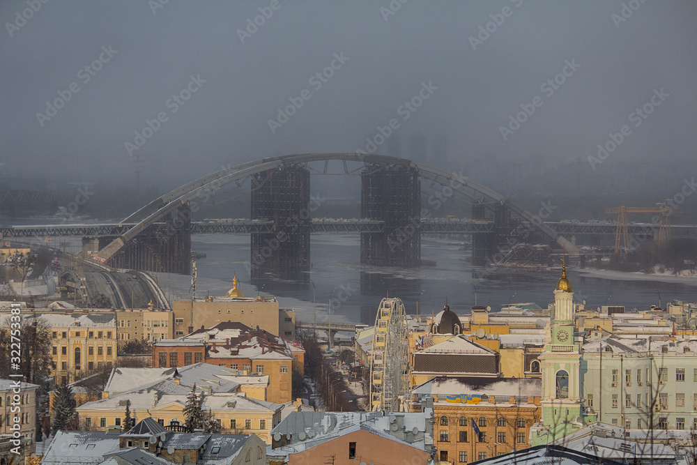 Unfinished Podilsko Voskresensky bridge in construction over a river taken. Kiev, Ukraine