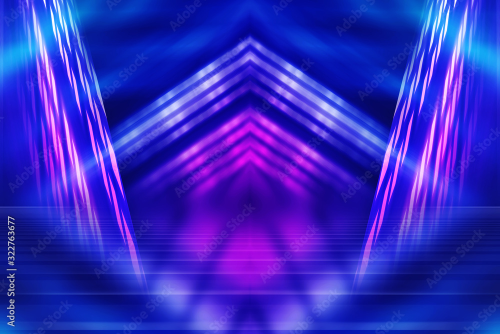 Abstract dark background with blue and pink neon glow. Neon lines of light. Background empty scene.