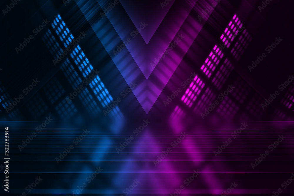 Abstract dark background with blue and pink neon glow. Neon lines of light. Background empty scene.