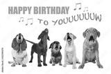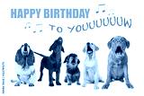 Group of dogs with various breeds looking up singing on a white background with the text Happy Birthday to you