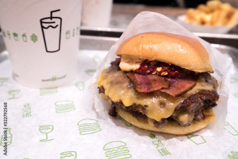 Tokyo Japan - March 27, 2019: Shake Shack Hamburger in Tokyo. Double cheeseburger with tomato lettuce and onion, Cheese Fries and Milkshake.