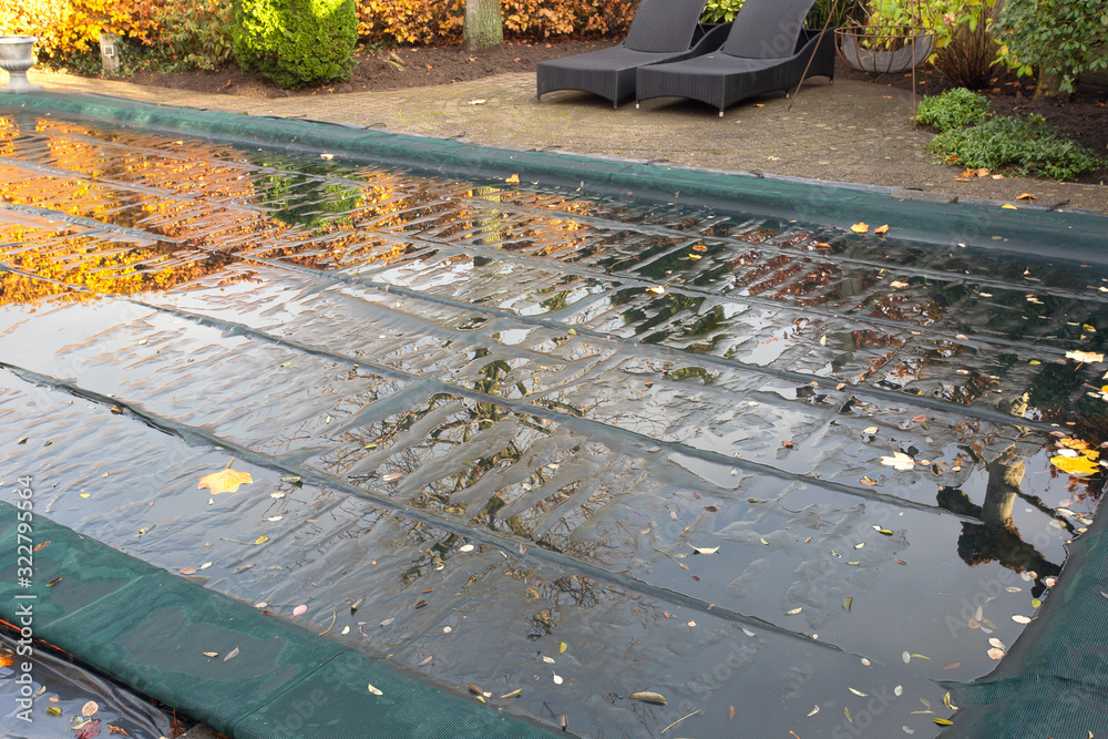 Garden swimming pool with swimming sail in the autumn, protection ready for winter