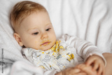 Feeding a baby vegetable puree. Dirty baby. The concept of childhood, first lure and baby food.