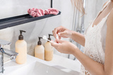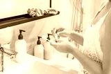 Dental care. Woman hands is holding toothbrush with toothpaste in bathroom, sink and running faucet in background"