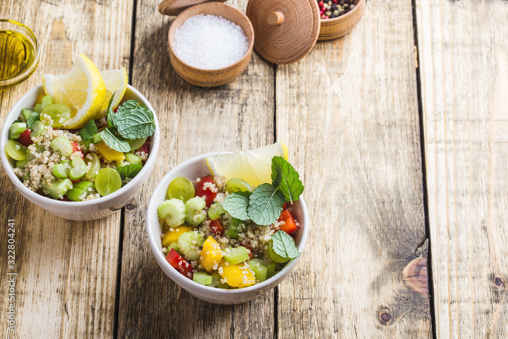 Plant based vegan bowl, quinoa salad with fresh vegetables