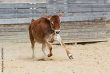 Jersey calf runs in a dairy farm, body portrait of a young cow on pasture in motion