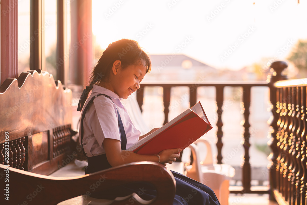Portrait of asian uniform little child student reading and smiling with happy at home