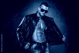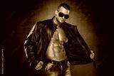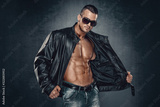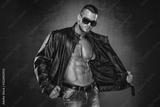 Handsome Athletic Male Model Wearing Leather Jacket on Naked Torso